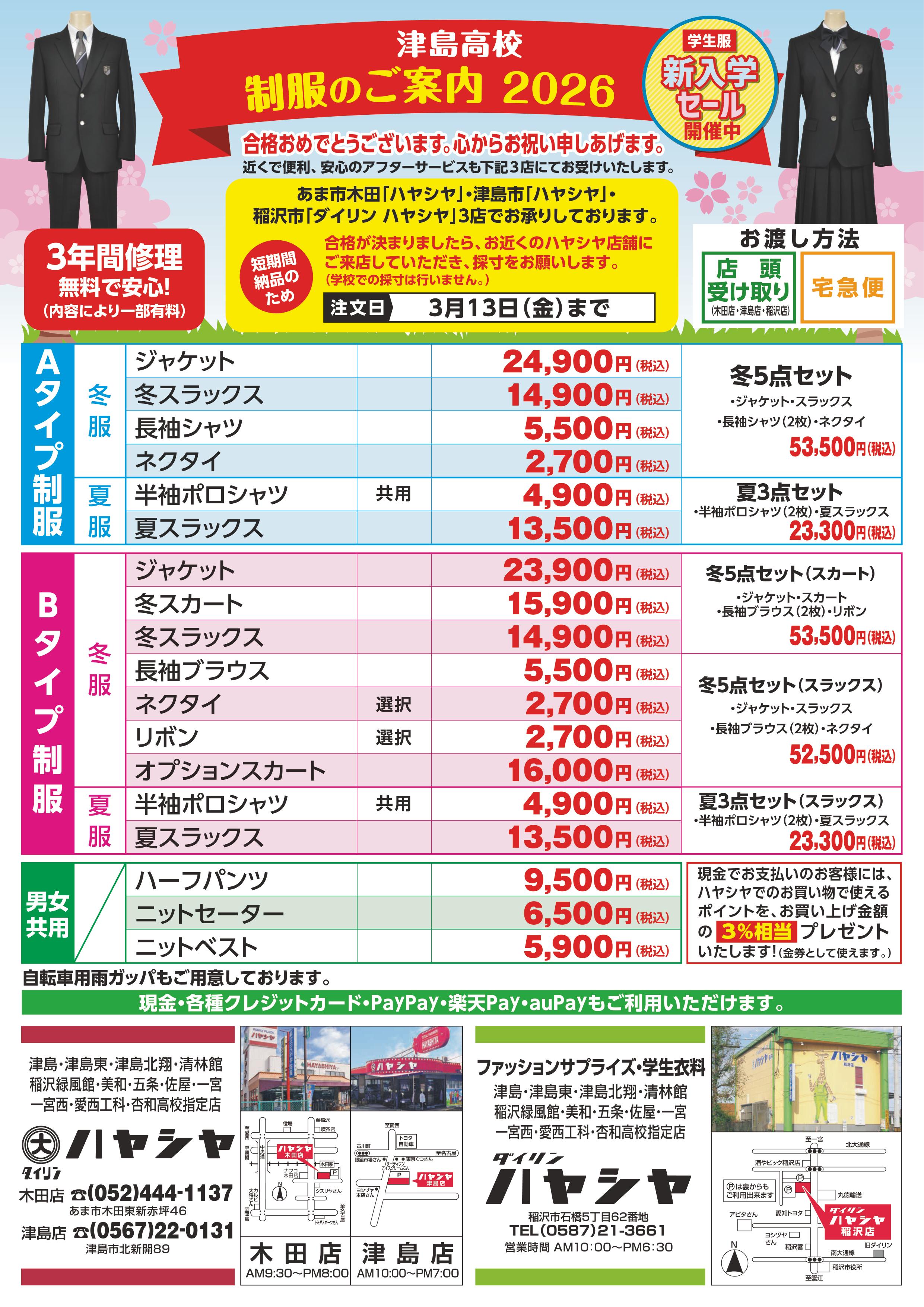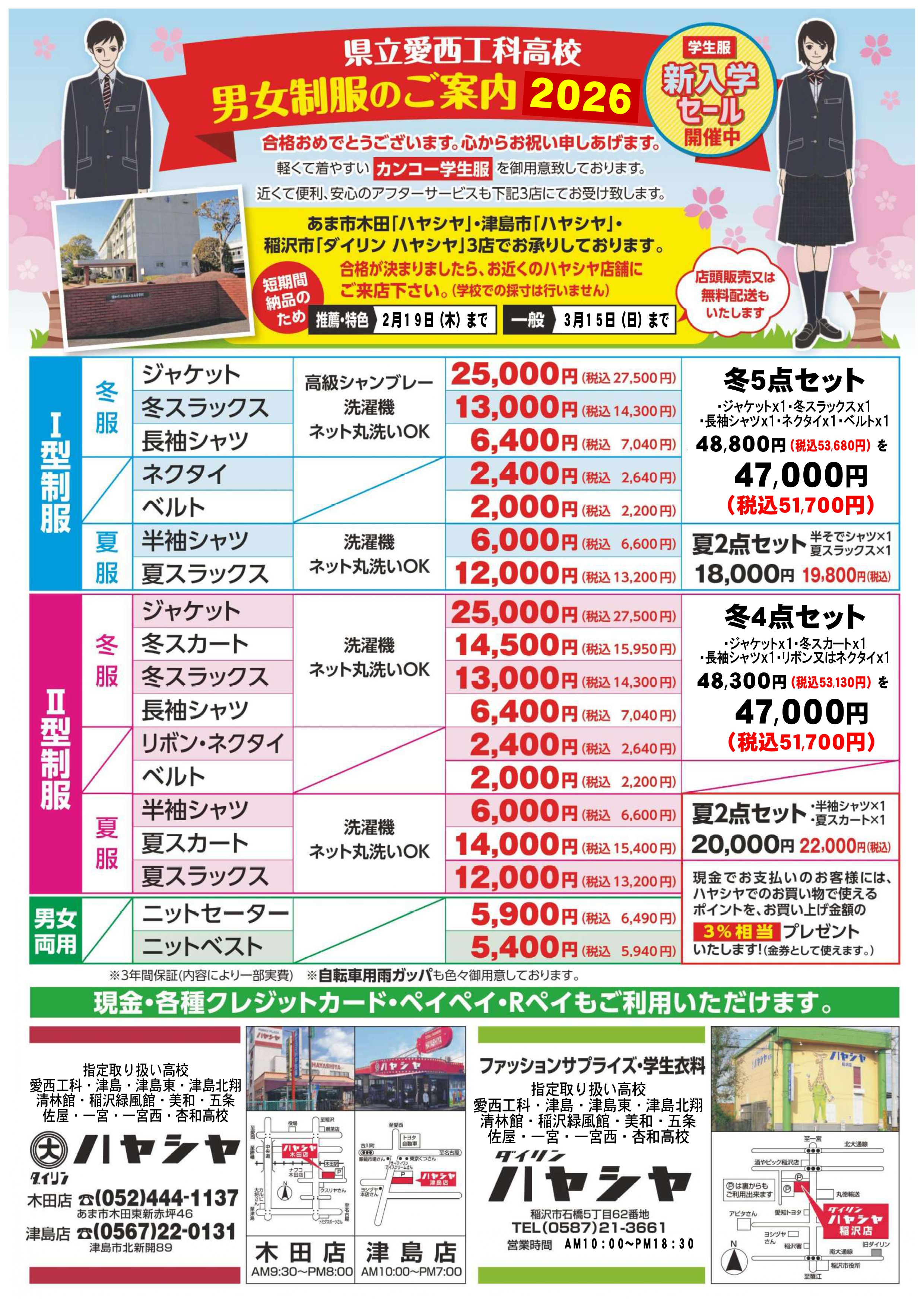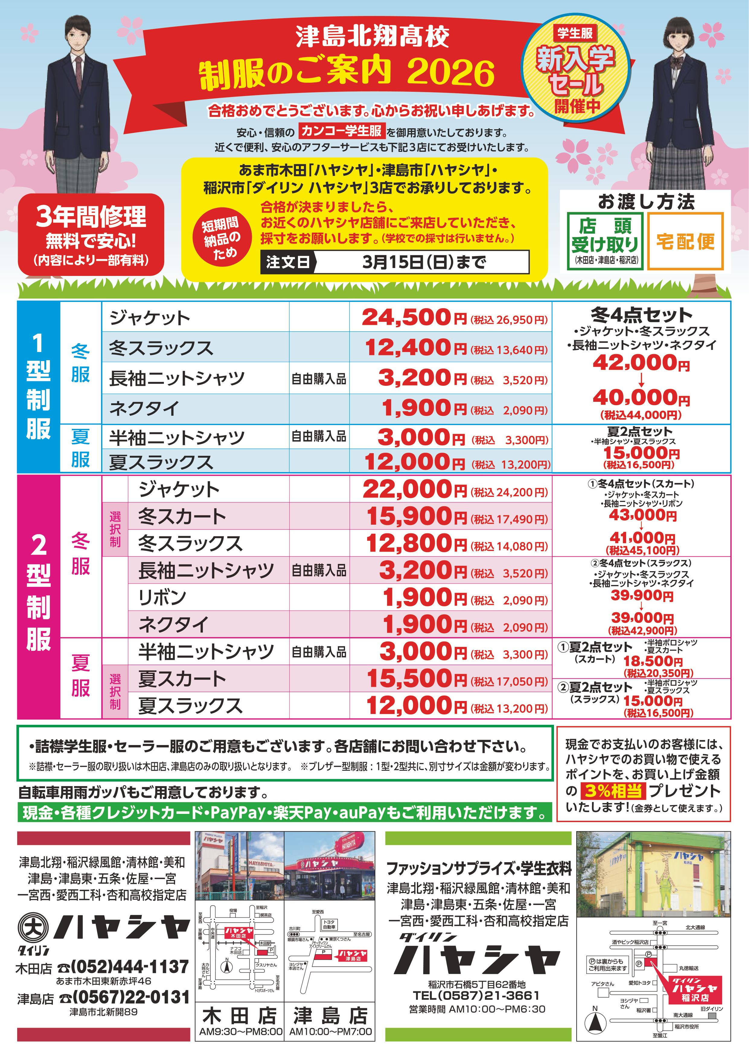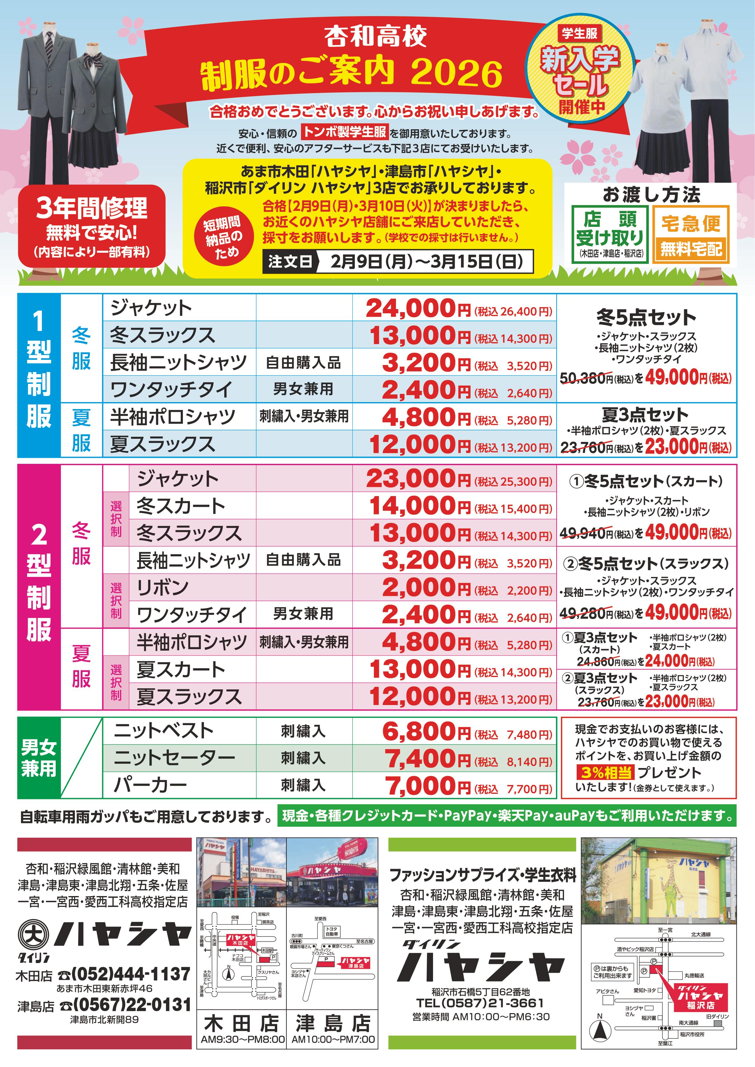 学生服のご案内制服取り扱い中学校 津島高校附属中学校 清林館中学校 あま市内中学校 津島市立中学校 愛西市立中学校 稲沢市立中学校 制服取り扱い高校 美和高校 五条高校 津島高校 津島東高校 津島北翔高校 佐屋高校 一宮高校 一宮西高校 稲沢緑風館高校 愛西工科高校 杏和高校 清林館高校 学生服のご案内 学生服のご案内