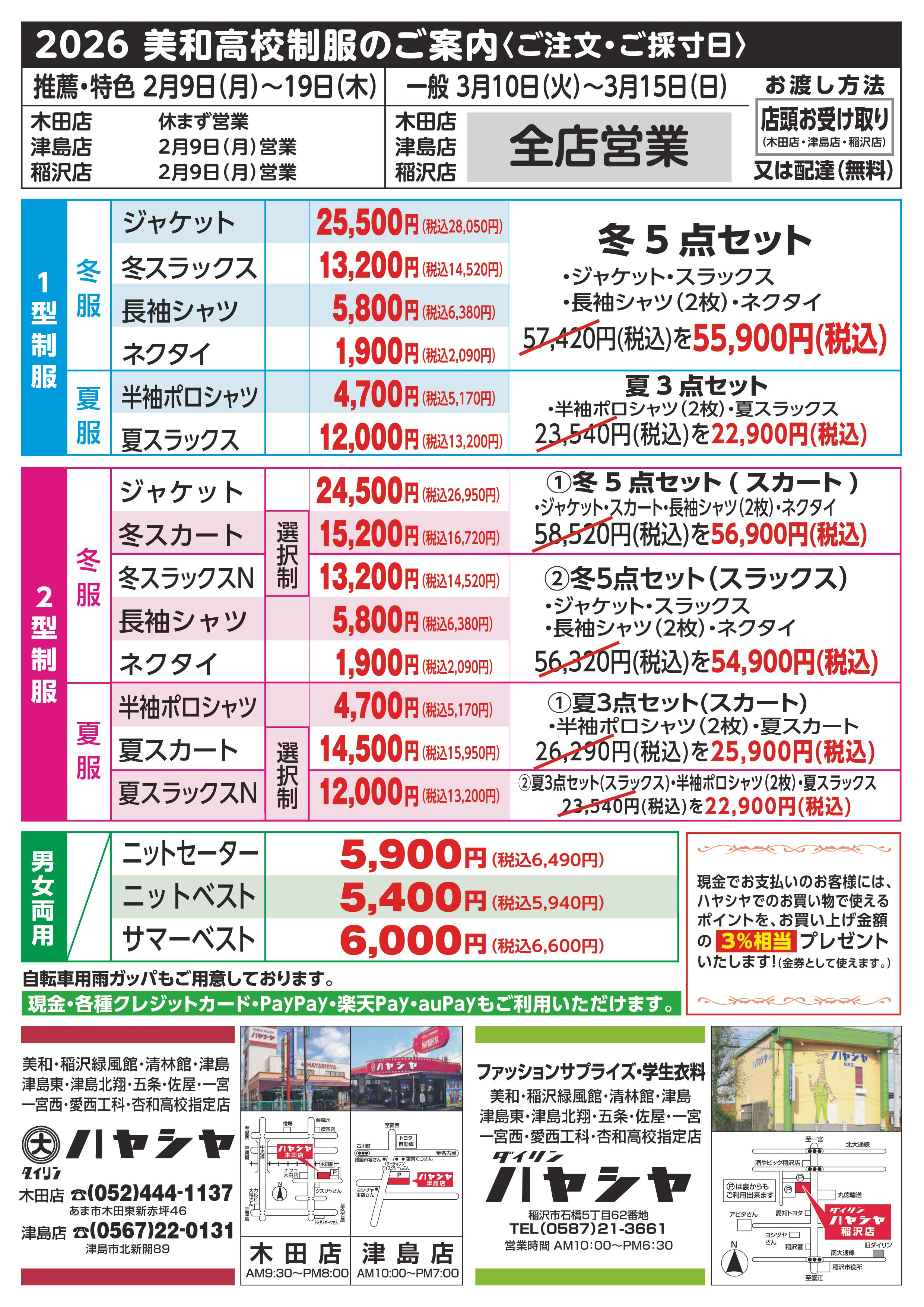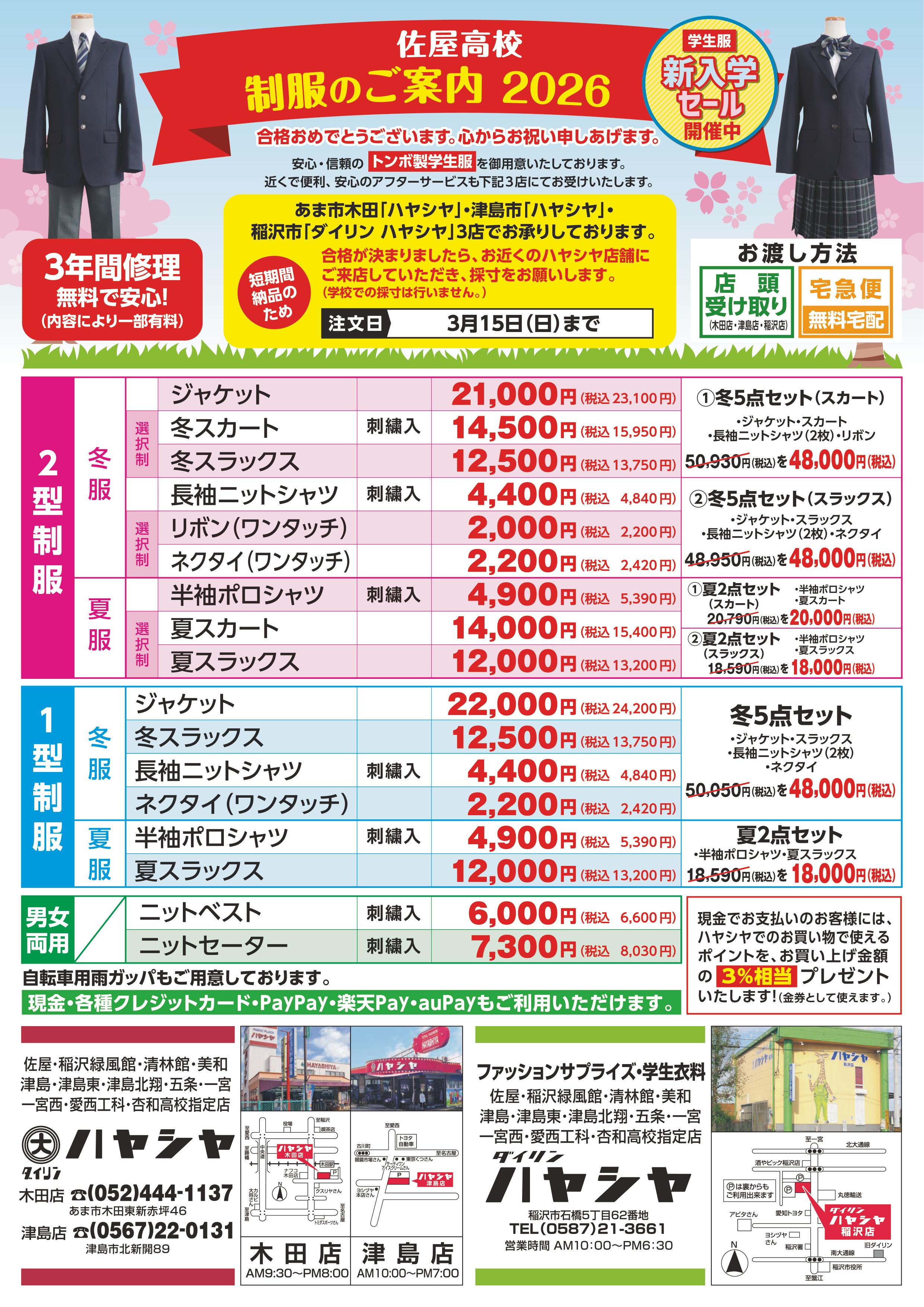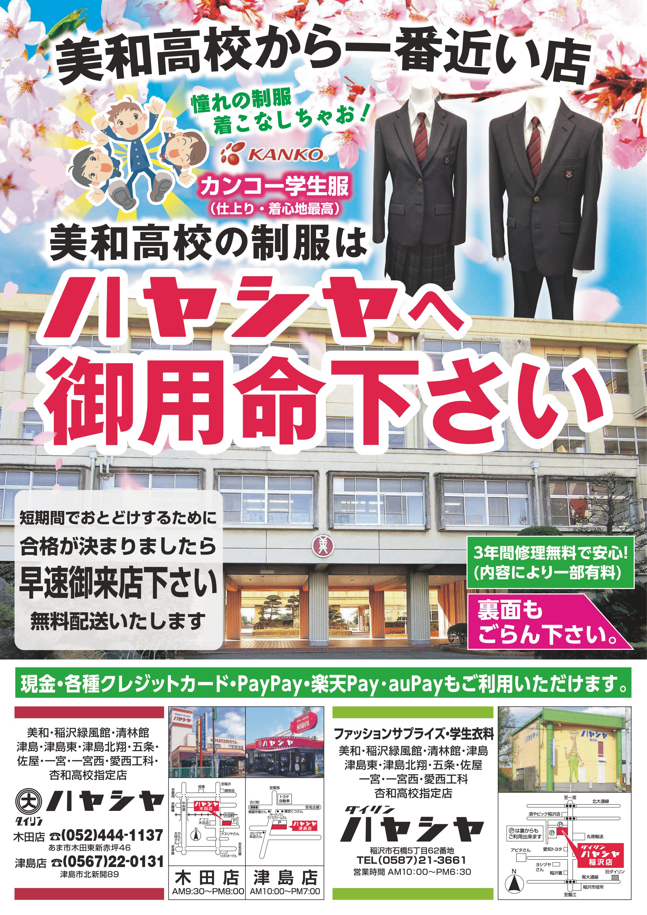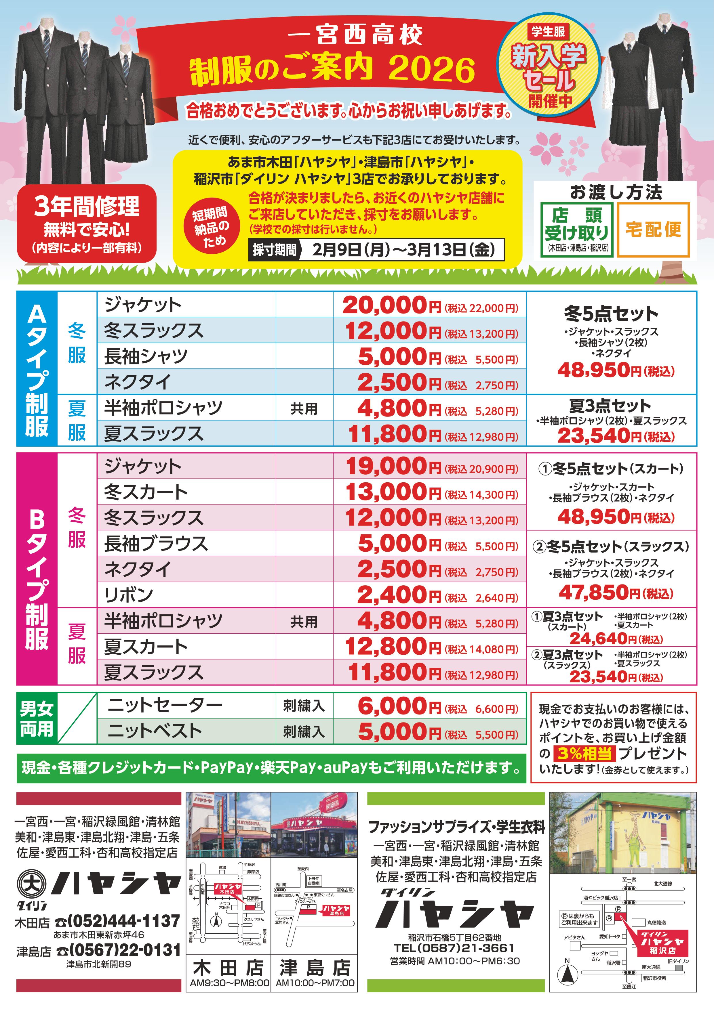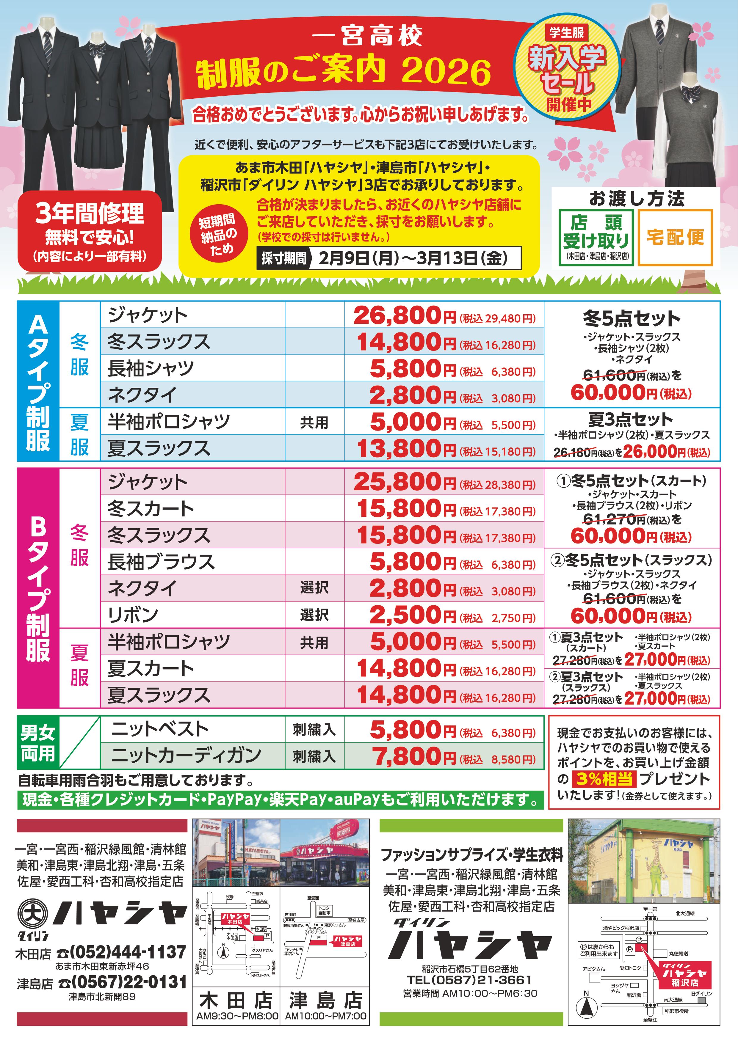学生服のご案内制服取り扱い中学校 津島高校附属中学校 清林館中学校 あま市内中学校 津島市立中学校 愛西市立中学校 稲沢市立中学校 制服取り扱い高校 美和高校 五条高校 津島高校 津島東高校 津島北翔高校 佐屋高校 一宮高校 一宮西高校 稲沢緑風館高校 愛西工科高校 杏和高校 清林館高校 学生服のご案内 学生服のご案内